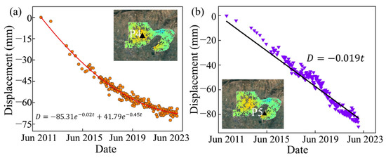 In contrast, the Liyuan mining area exhibits a significant difference to the Xiadian mining area. Throughout the 10-year monitoring period, the Liyuan mining area remained in a post-closure state. Following closure, the rising groundwater levels and changes in rock mass structure contributed to an uplift tendency. The uplifting velocity decays from 5 mm/year to 1 mm/year correspond to the exponential tendency of groundwater recovery in the post-closure areas [47].
