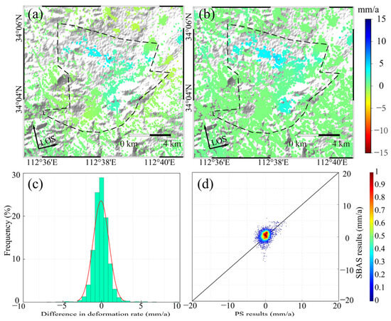 The cross-validation of InSAR results using PS and SBAS methods: (a) PS deformation rate in Liyuan mining area; (b) SBAS deformation rate in Liyuan mining area; (c) histogram of the difference between PS and SBAS; and (d) density scatter of two measurements.