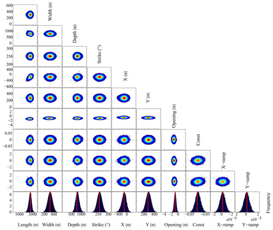 Therefore, the uncertainty gives an indication of the confidence interval of the inverted parameters. Here, we also constrained the initial intervals of the target parameters, considering the range of the deformation area and the minging depth, as follows: length m, width and depth m. We performed iterations and removed the first iterations as the burn-in period because the starting samples may highly depend on initial parameter settings and may not represent the real posterior PDFs.