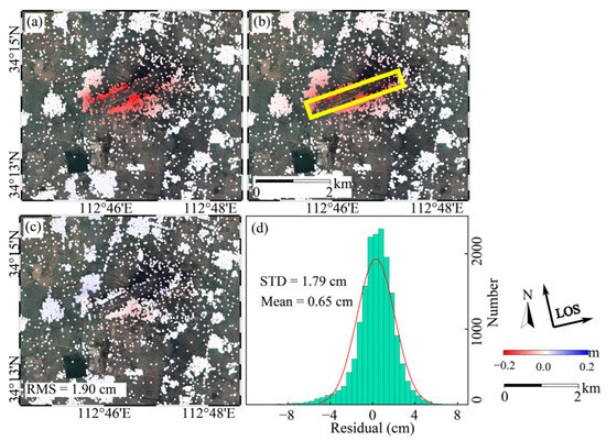 Due to the lack of in situ measurements, this study assessed the reliability of the PS-InSAR results by a cross-validation with SBAS-InSAR [35,36]. For SBAS analysis, the maximum temporal and spatial baseline thresholds were set as 96 days and 150 m, respectively. The SBAS stacks contain 538 interferograms (see Figure 3b).