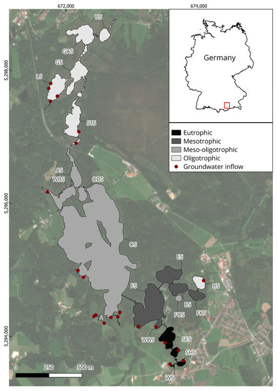 There are 19 interconnected lakes in the Lake District with a total surface area of 215 hectares and maximum depths ranging from 5 to 30 m. Despite the area’s high precipitation, most lakes are sustained either directly or indirectly through other lakes by groundwater inflow (Figure 1). They are notably categorized as hard-water lakes due to their elevated concentrations, resulting in a saturation index () of 4.8 ± 1.2 [49] and slight alkalinity (pH ranging from 7.5 to 8.8) [50]. Experts assumed that initially, all the lakes were oligotrophic [51]. However, ongoing agricultural activities around the southernmost lakes and municipal wastewater inflows from the village of Iffeldorf until the mid-1980s led to eutrophication [50]. Nowadays, the lakes display a distinct trophic gradient, with the southern lakes exhibiting eutrophic conditions and the northern lakes maintaining oligotrophic conditions (see Figure 1; Table 1) [52]. Based on this gradient, the lakes are categorized as southern (eutrophic), northern (oligotrophic), and central and eastern (meso- and meso-oligotrophic) lakes, presenting a unique model system to address ecological questions.