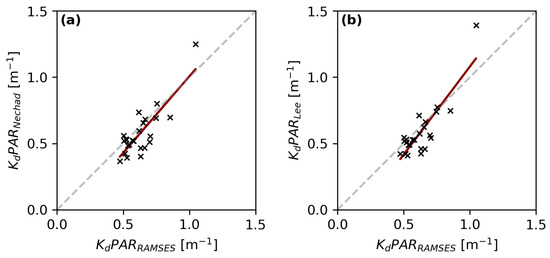 Figure 3 shows a comparison of satellite-derived and in situ-measured using the TriOS RAMSES radiometer. Table 2 provides additional statistics and accuracy measures. A total of 21 spatiotemporal match-ups between in situ and remotely sensed data were obtained. Figure 3 and Table 2 show that the two algorithms performed similarly. The in situ measurements ranged from 0.47 to 1.05 m−1. In comparison, the remotely sensed data covered a broader range, as follows: 0.37 to 1.22 m−1 using the Nechad algorithm and 0.41 to 1.39 m−1 using the Lee algorithm. The satellite-derived tended to underestimate lower values (<0.8 m−1) and overestimate higher ranges, resulting in a mean bias error of 0.05 m−1 for and 0.04 m−1 for (Table 2). Specifically, underestimates to a lesser extent than for lower values. For higher values, however, our analysis indicates that overestimates more than . The intercept and slope of the linear regression fit shown in Table 2 and Figure 3 suggest that was more accurate across the entire range of . Nevertheless, most of our data were in the lower range of <0.8 with a mean in situ of 0.63. Therefore, the Pearson correlation coefficient r and the coefficient of determination favor , as they underestimate less at lower values. Consequently, we selected for further processing.