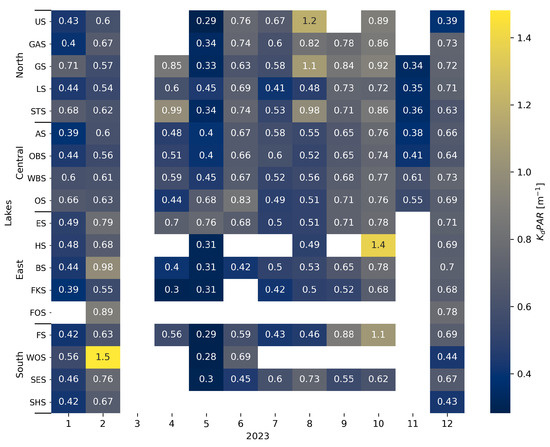 The algorithm by Lee et al. [61] was applied to the entire dataset to compute . Figure 4 displays the results for each lake as mean values per month. Data were available for every month in 2023 except for March. During this month, cloud coverage and atmospheric conditions prevented retrieving from Sentinel-2 MSI data. Figure 4 illustrates temporal patterns, with clear water phases in May and November (low ) and phases of high attenuation from August to October in almost all lakes. Differences between lakes within the same months were less pronounced.