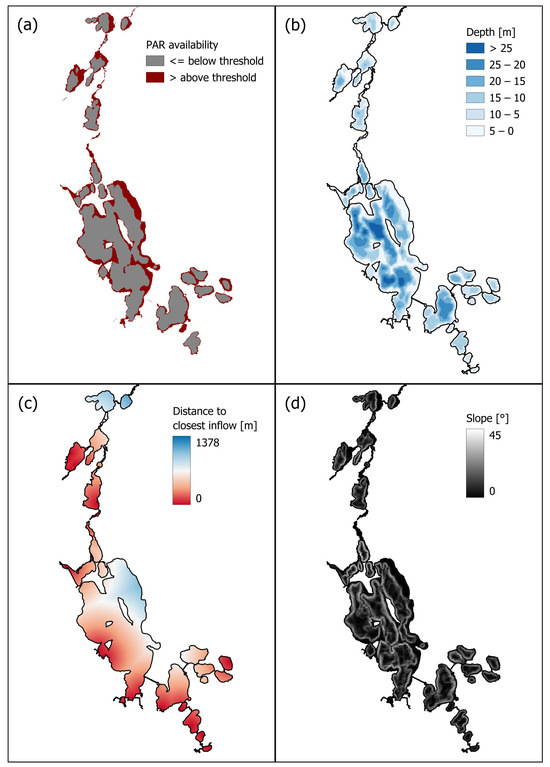Abiotic predictors for the HSM: (a) PAR availability above threshold, (b) water depth, (c) distance to the nearest groundwater inflow, and (d) littoral slope.