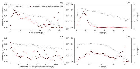 Comparison between the probability of macrophyte occurrence based on sonar mappings and abiotic predictors: (a) PAR availability, (b) water depth, (c) distance to the nearest groundwater inflow, and (d) littoral slope.