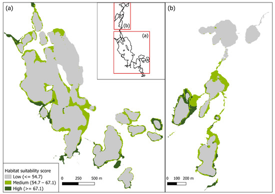 Modeled habitat suitability for macrophytes in 2023. (a) Central, southern, and eastern lakes, (b) northern lakes.