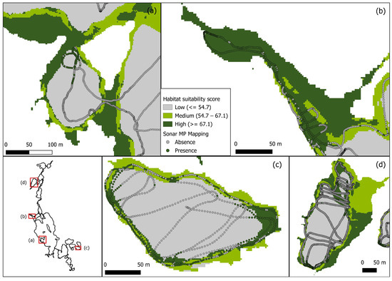 Figure 9 shows more detailed views of areas of high potential habitat suitability, along with the tracks of the hydroacoustic macrophyte habitat mapping. Figure 9b,c show examples in Lake WBS and Lake FKS where modeled potential habitats align well with the patterns of the actual habitats. In contrast, in Figure 9a,d, the potential habitats differ from actual habitats.