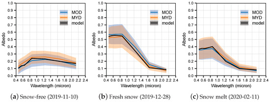 Spectral variations and deviations of MOD, MYD, and modeled albedos under snow-free, fresh snow, and snow melt scenarios.