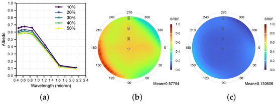 In Figure 15a, the impact of pollutant concentration on the snow-covered urban canyon’s albedo spectrum is evident. The albedo, particularly in the visible and near-infrared (400–1000 nm) bands, is significantly affected, with an average albedo of approximately 0.6 for a concentration of 100 ppb, which doubles to around 645 nm when the concentration is ppb. However, this influence is negligible in the shortwave infrared (1600–2200 nm) range. The comparison in Figure 15b,c illustrates that, when a soot pollutant concentration of ppb is introduced, the bidirectional reflectance in Band 1 decreases notably across the entire hemisphere, as opposed to Figure 14b, where the difference in Band 6 remains minimal.