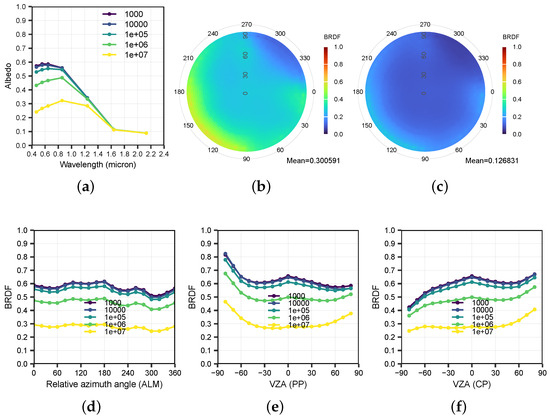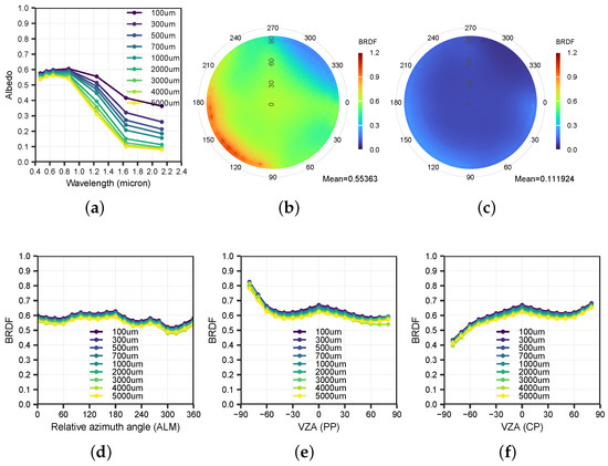 Figure 16 demonstrates the effect of SZA on albedo spectrum and bidirectional reflectance. As the SZA rises from 40° to 80°, a slight decrease in spectral reflectance is noted in the visible and infrared bands. The angular distribution of bidirectional reflectance across the hemisphere is shown in Figure 16b,c, with domain-averaged values of 0.598 for Band 1 and 0.141 for Band 6. The increase in SZA leads to enhanced forward scattering, primarily due to the strong forward scattering characteristic of snow at high incident angles [4,8,11].