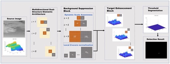 The flowchart of the proposed algorithm is shown in Figure 1. We propose an infrared dim and small target detection algorithm based on morphological filtering with dual-structure elements. First, we design a directional dual-structure element morphological filter. Subsequently, we perform multidirectional morphological filtering and local Z-score normalization at each scale. Finally, we dynamically identify the scale with the highest response in each direction and maximize the enhancement of the target by fusing the results from all directions.