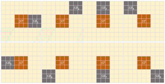 Figure 2 illustrates the dual-structure elements of size 3 in 8 directions. The first is a rectangular structural element representing the target region and marked in orange. Its size is related to the size of the target to be detected. The second structural element represents the background region centered on and is marked in dark gray. We split the background structural element into 8 directions . The size of in the i-th direction is the same as that of . We then perform eight filtering operations, which are each based on a dual-structure element in a different direction.