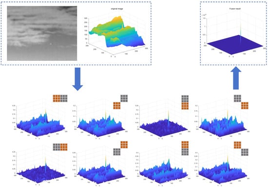 where k represents the side length of the square template. As analyzed above, there is a high probability that the targets will have a high response in all directions. The final fusion result of responses in 8 directions is given similarly to Equation (4), and can be expressed as