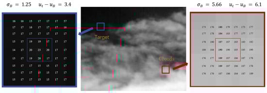 where and denote the mean value of the target region and its surrounding background region, as shown in Figure 8, and is the standard deviation of the background. Here, the SCR is calculated using the mean value of the target region; hence, it is also known as the mean signal-to-clutter ratio (MSCR). Similarly, we can measure the ratio of the intensity of the peak signal of the target to the background clutter by replacing the mean value with the maximum value in the target region in Equation (10), which is known as the peak signal-to-clutter ratio (PSCR).