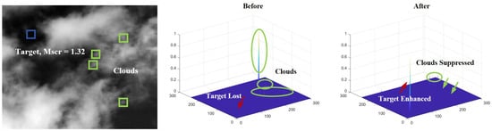 In the sky background, clouds are major contributors to false alarms because they are the main radiation source aside from the target. Despite suppressing false alarms that are inconsistent with the target’s directional characteristics, anisotropic cloud false alarms remain. In regions with large areas of cloud, there are significant grayscale variations; the difference in grayscale between peaks and adjacent areas is much greater than in regions without clouds. In the operations described above, when the target’s grayscale is low and the cloud clutter is strong, it is difficult to highlight the target using absolute grayscale features.