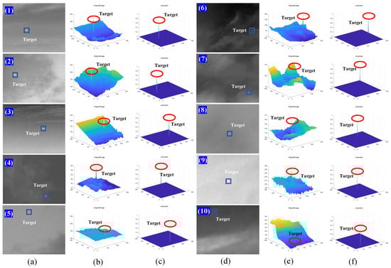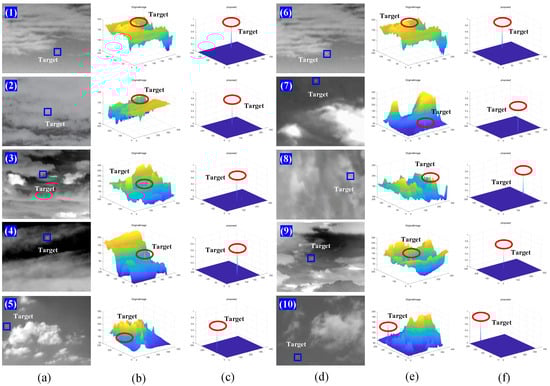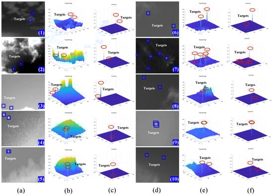 In Figure 11, we use another 10 sets of data to illustrate the robustness of our algorithm in complex sky scenes. These data are also from the SIRST dataset. As shown in the 3D display of the original images in columns (b) and (e), compared to the previous set of data in Figure 10, the overall undulation of the image background is larger, the prominence of the targets is greatly diminished, and some targets are even submerged in the background. However, as seen in (c) and (f), our method still maintains excellent background suppression, and the targets are greatly highlighted, making it easier to separate the background from the targets subsequently.