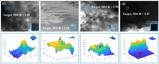 Let be the peak value of the target, and let and be the mean values of the target and background regions, respectively. For small targets, the relationship typically holds in most cases, leading to PSCR being greater than MSCR. However, when the target is extremely weak, the relationship may occur, causing MSCR to be less than PSCR when taking the absolute value in Equation (10). As shown in Figure 9, most of the data we used contain very weak targets, highlighting the challenge for detection.