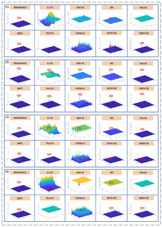 To further illustrate the capability of our method, Figure A3, Figure A4 and Figure A5 give the detection results of nine images not shown in the main text, while the MSCR of the target is labeled in the figures. Figure A6, Figure A7 and Figure A8 show the results of the 3D map of the proposed algorithm in this paper compared to other baseline algorithms.