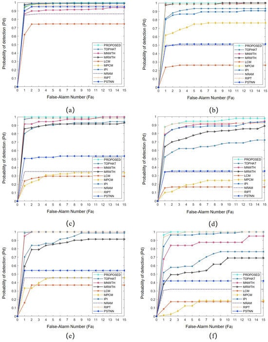To further evaluate the performance of the proposed method, the receiver operating characteristic (ROC) curve is used as a key evaluation metric. It shows the relationship between the true positive rate (TPR) and the false positive rate (FPR). The TPR and FPR in infrared small target detection are defined as follows: