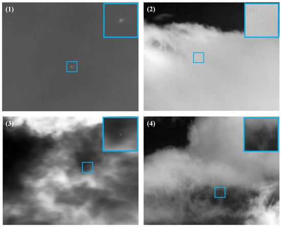 Our experimental data include two parts. The first part is the public dataset of SIRST [], which contains 315 images of sky scenes required for our experiments. Both homogeneous and non-homogeneous backgrounds are included. According to the literature [], the maximum resolution of the target is 78 pixels, and the minimum is 4 pixels. A few images contain more than two targets.