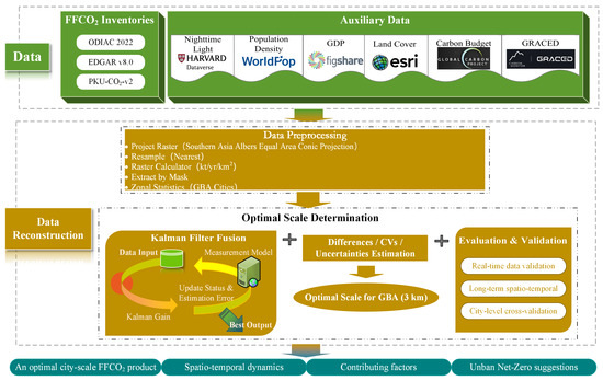 Accurately characterizing spatial and temporal patterns of urban surface emissions poses a challenge for individual FFCO2 emission inventories. The differences and coefficients of variation (CVs) among these inventories must be quantified and incorporated into the reconstruction algorithm. A crucial aspect of the reconstruction process is establishing a connection between global and regional scales. Various studies have demonstrated that leveraging mathematical models such as regression, assimilation, and neural networks, along with data sources like population figures, road networks, and NTL data, can significantly enhance the accuracy of the spatio–temporal allocation of FFCO2 emission inventories [56]. This study introduces a Kalman filter fusion algorithm to reconstruct a new FFCO2 emission dataset at regional and urban scales. Subsequently, the temporal trends and spatial characteristics are verified based on Carbon Budget and GRACED data (refer to Figure 2).