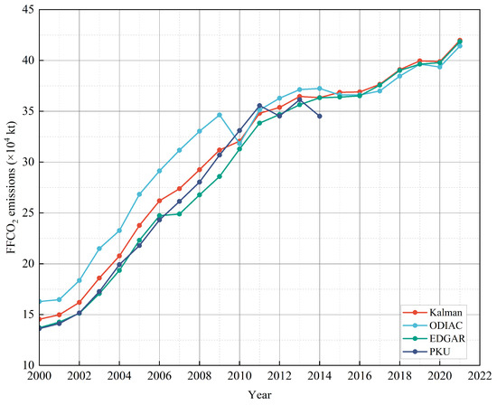 Temporal trend of Kalman filter–fused FFCO2 emissions in GBA from 2000 to 2021, with comparison to ODIAC, EDGAR, and PKU.