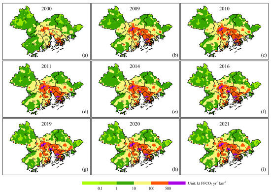 (a–i) Kalman fusion results of FFCO2 spatial distribution (3 km) in GBA in 2000, 2009, 2010, 2011, 2014, 2016, 2019, 2020 and 2021.