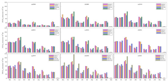To determine the Kalman fusion results at the city level and analyze the regular center–shift pattern of intercity emissions [62,63], we further estimated the FFCO2 emissions of cities in the GBA during significant transition years, as illustrated in Figure 6. It is evident that prior to 2014, both the reconstruction results and the PKU data exhibit higher sensitivity to high–value emission zones. However, post–2014, the reconstruction results demonstrate similar sensitivities to high–value emission zones as ODIAC and EDGAR. This indicates that the reconstruction results can effectively capture the emission status of key cities in the GBA, revealing the shift in emission centers among cities. Overall, the FFCO2 emissions of all 11 cities in the GBA exhibit an upward trend over the 21–year period, aligning with previous research findings [64,65]. This trend contradicts the notion that emissions peaked in 2016 and subsequently declined annually [62]. Our results suggest a temporary growth slowdown between 2014 and 2016, followed by a sustained increase in emissions.