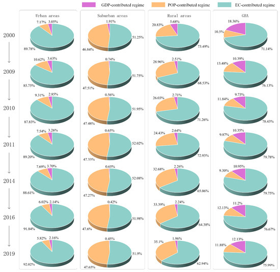 In the context of shifting FFCO2 emissions within the GBA over time, the conventional ‘core–periphery’ pattern [67] may no longer serve as the most reliable indicator of transition or cross–border emission dynamics. To better understand these changes, we delineated the Urban–Rural Divide within GBA lands based on 10 m Esri Sentinel–2 Land Cover Type data, categorizing regions into ‘Urban’, ‘Suburban’, and ‘Rural’ areas. Concurrently, we integrated spatio–temporal socio–economic data (NTL, GDP, POP) to gain insights into the sources of emissions at the urban–rural interface (refer to Figure 1b). Using the Urban–Rural Divide as a mask, we conducted a comprehensive analysis employing multiple regression analysis to assess the contributions of factors such as GDP, POP, and energy consumption (EC) which can be indirectly inferred from NTL data [70], to emissions in urban, suburban, and rural areas of the GBA. Our findings, illustrated in Figure 7, reveal intriguing trends in the sensitivity of FFCO2 emission formation based on the aforementioned contributors over time. From 2000 to 2009, there was a notable increase in the share of EC–contributed emissions across the GBA, followed by a decline from 2011 to 2019. This decline aligns with heightened restrictions and controls on energy consumption, indicating a positive impact on reducing FFCO2 emissions regionally. However, a contrasting pattern emerged in urban areas, where the proportion of EC–contributed emissions exhibited fluctuations, suggesting challenges in effectively curbing urban energy consumption despite ongoing emission reduction policies. Interestingly, suburban areas maintained a relatively stable share of EC–contributed emissions, while rural regions experienced a decline, possibly reflecting a trend of rural–to–urban migration within the GBA. The diminishing role of energy consumption and population [71] in rural emissions underscores the shifting dynamics within the region. Moreover, our analysis highlights the significant influence of energy consumption on suburban emissions, with GDP playing a more prominent role in suburban areas compared to their urban and rural counterparts. Notably, suburbs located in peripheral cities like ZQ, HZ, and JM demonstrate a balanced interplay between GDP and energy consumption effects over the 21–year period. This approach and these findings quantitatively estimate the relevance of different development levels of Urban–Rural Divides to specific human activities or emission sources, explore cross–border emission dynamics. However, they imply the intricate interplay of socio–economic factors in driving emissions patterns within the GBA. It is therefore recommended that more high–precision data and targeted strategies be employed to address the evolving dynamics of urban–rural emissions.