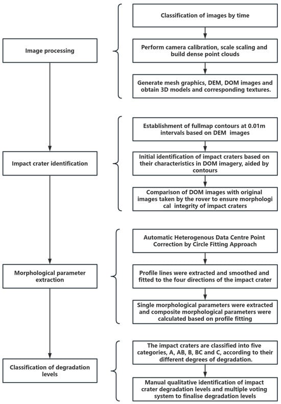The panoramic camera images captured by Yutu-2 were processed to obtain the DEM and DOM images. Impact craters were then manually extracted from the images using algorithms to correct the centre of the extracted impact craters and extract the required morphological parameters. Subsequently, the degradation grades were classified in conjunction with the spatial morphology of the impact craters. Finally, the degradation grades and the corresponding morphological parameters of the craters were employed to conduct a study of the degradation patterns of the impact craters and the distribution patterns of the morphological parameters on the backside of the moon. The research method is illustrated in Figure 2.