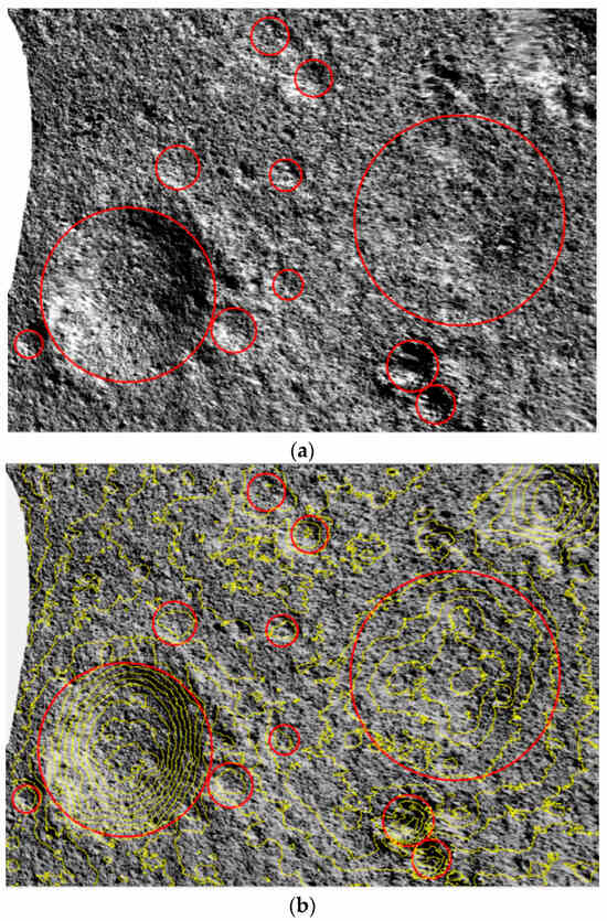 Impact craters have depressed circular features, so they are identified based by the contrast between light and dark features under lighting conditions. In this study, the impact craters in the generated DOM and DEM images were identified and marked using the CraterTools software (https://www.geo.fu-berlin.de/en/geol/fachrichtungen/planet/software/index.html, accessed on 2 June 2023).