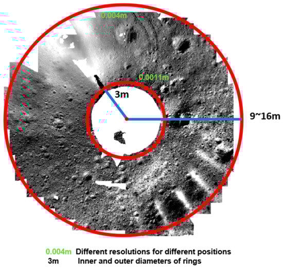 We used the DEM and DOM images produced by Yutu-2’s panoramic camera [] as the image data and assigned geo-referenced coordinates (GCS_Moon_2000). The resolutions of DEM and DOM images are variable, with a resolution of 0.0011 m at close range and 0.004 m at longer range. The panoramic camera is equipped with two imaging modes: colour imaging and panchromatic imaging. These modes can be switched between the two modes during the shooting process. The image resolutions of the colour mode and the panchromatic imaging mode are 2352 × 1728 pixels and 1176 × 864 pixels, respectively. The camera’s field-of-view angle is 19.6° × 14.5° []. The panoramic camera is designed to capture 360° images around the station by utilising the mast’s up-down and left-right rotation. A total of 56 images can be captured in each turn, including 28 pairs of images in different directions at two altitude angles. Figure 1 displays a section of imagery captured by a panoramic camera. This enables the three-dimensional stereo imaging of the topography and landscape of the landing and roving areas []. Consequently, the panoramic camera on Yutu-2 can achieve clear imaging from the foot of the rover to the farthest point in the field of view, with a spatial resolution can reach the millimetre scale during close observation. As of 20 September 2023, the Chang’e-4 mission has completed its 62nd lunar day. The study utilised data from the panoramic camera images captured between the 27th and 33rd days of the lunar days.