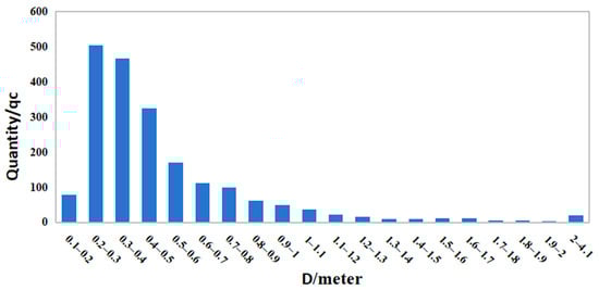 The diameters of all impact craters at the ten stations were enumerated. The smallest impact crater diameter was 0.098 m, the largest was 4.077 m, and the mean value was 0.503 m. There were 19 impact craters with diameters greater than 2 m, 151 with diameters greater than 1 m, and 79 with diameters less than 0.2 m. Figure 8 presents the size–frequency statistics of the impact craters with diameters of less than 2 m. The impact craters with diameters between 0.2 and 0.3 m exhibited the highest frequency, reaching 504, followed by those between 0.3 and 0.4 m, with a frequency of 466. The majority of the impact craters (over 80%) were concentrated in the diameter range of 0.2–0.8 m, with the 0.2–0.5 m range accounting for 64.4%. The data set primarily comprised sub-metre impact craters were extracted. The impact craters were numerous and concentrated in size, with a gradual increase infrequency as their diameters decreased with diameters below 2 m.