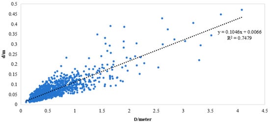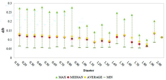 The relationship between the diameter and depth of an impact crater is depicted in Figure 11. The impact crater depth–diameter ratio values were distributed across a range of diameter segments from 0.1 to 2 m. The minimum depth–diameter ratio value was close to 0.06. The impact craters with diameters of less than 1 m exhibited a maximum depth–diameter ratio value of greater than 0.25. The maximum difference in the depth–diameter ratios was observed in the diameter range of 0.4 to 0.5 m. The mean value of the depth-to-diameter ratio was 0.22. The median and mean values of the depth–to-diameter ratio demonstrated a general downward trend with increasing diameter, although this decline was not particularly pronounced. The depth-to-diameter ratio values exhibited a notable increase increased at diameters of 1.4–1.5 m and 1.9–2.0 m. This may have been an inadvertent consequence of the limited data on impact craters with diameters of exceeding than 1 m. Overall, there was some variation in the depth-to-diameter ratio with diameter. The depth-to-diameter ratios of the impact craters with diameters below 2 m exhibited a decreasing trend with increasing size, although the degree of decrease was insignificant.