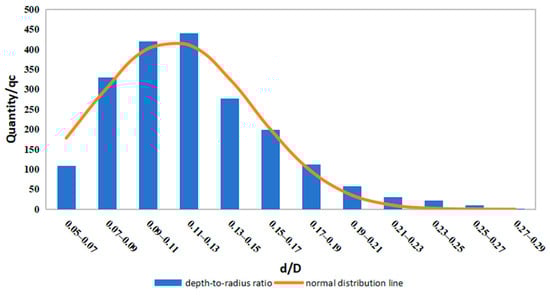 Figure 10 presents the frequency statistics of the depth-to-diameter ratio. The depth-to-diameter ratios of the impact craters exhibited a normal distribution, with values ranging from 0.053 and 0.29, a mean of 0.122, and a variance of approximately 0.039. The depth-to-diameter ratios were found to be concentrated in the range from 0.07 to 0.17, with more than 80% of the data falling within this range. Furthermore, 50% of the impact craters exhibited depth-to-diameter ratios in the range from 0.09 to 0.13.