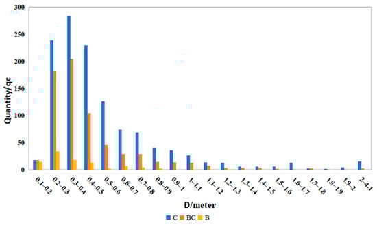 The relationship between the diameter of impact craters and their degradation is illustrated in Figure 13. The majority of Class C impact craters exhibited a high percentage (greater than 50%) in the majority of the diameter bands. The median diameters of the Class B, BC and C impact craters were 0.29 m, 0.35 m, and 0.42 m, respectively. The degradation level of the Class B impact craters in the size intervals of 0.1–0.5 m, 0.5–1 m, 1–1.5 m, and 1.5–2 m, varied in ratio from 5.83% to 3.67%, 2.11%, and 0%; that of Class BC impact craters varied from 37.32% to 26.88%, 32.63%, and 21.62%; and that of Class C impact craters changed from 56.85% to 69.45%, 65.26%, and 78.38%. The statistical analysis indicates show that the degradation of the small impact crater group was significant, with the majority impact craters formed by the impact of small objects on the lunar surface. The limited energy of these impacts prevented the occurrence of a violent melting process in the material, which, in turn, limited the size of the formed craters. In addition, the material strength of the walls of these craters was lower than that of large craters, making them susceptible to degradation. However, the presence of impact craters with diameters less than 1 m diameter with Class B degradation indicated that the small impact craters had both severely and moderately degraded parts. This, in turn, indicated that the small impact craters had a low degree of solidity and were easily degraded and that fresh impact craters could easily be generated under the influence of external forces and other factors, while the original impact craters were continuously degraded.