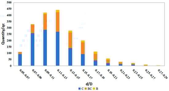 The relationship between impact crater depth and degradation class is shown in Figure 14. The average depth-to-diameter ratios of Class C, BC, and B impact craters were 0.112, 0.132, and 0.165, respectively, with 80% of the Class C impact craters having depth-to-diameter ratios in the range of 0.053–0.153; 80% of the Class BC impact craters having ratios in the range of 0.073–0.173; and 80% of the Class B impact craters having ratios in the range of 0.093–0.213. Overall, the ratios of the Class C impact craters increased and decreased with the increasing in the depth-to-diameter ratio, changing from 83.44% to 75.21%, 68.26%, 57.58%, 50.54%, 45.30%, 37.37%, 32.00%, 30.00%, 28.57%, 0.00%, 0.00%, and 0.00%, respectively. The ratio of Class B impact craters gradually increased from 0.63% to 0.85%, 3.42%, 4.55%, 7.73%, 17.17%, 22.00%, 26.67%, 28.57%, 55.56%, and 50.00%, showing that the number of impact craters with severe degradation increased as the depth-to-diameter ratio decreased.