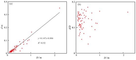 Results of the existing study. (a) shows a plot of diameter versus depth, and (b) shows a plot of diameter versus depth-to-diameter ratio.