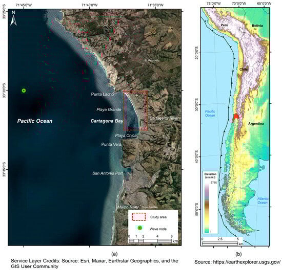 (a) Study site of Playa Grande Beach in Cartagena Bay (Valparaiso Region), located between Punta Lacho and Punta Vera Capes. Green point wave node and (b) location of Valparaíso Region in Central Chile.