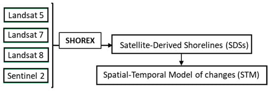- Palomar-Vázquez, J.; Almonacid-Caballer, J.; Pardo-Pascual, J.E.; Sanchez-García, E. SHOREX: A new tool for automatic and massive extraction of shorelines from Landsat and Sentinel 2 imagery. In Proceedings of the 7th International Conference on the Application of Physical Modelling in Coastal and Port Engineering and Science (Coastlab), Santander, Spain, 22–26 May 2018. [Google Scholar]