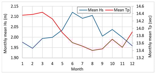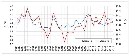 Annual mean wave climate conditions (1985–2019) described by the Hs (m) and Tp (s).