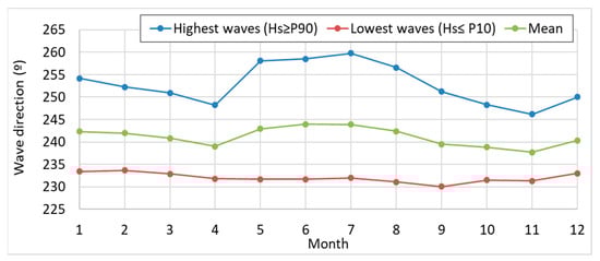 When analyzing the monthly variation of wave characteristics (Figure 4 and Figure 5), it can be seen how, during the spring and autumn, the waves come with a somewhat more southerly direction, while in early summer and winter, waves with a slightly more westerly origin dominate. It is evident, however, that the average difference is minimal (less than 7°), but there is a clear relationship according to the height of the waves. The lower waves come from more southerly positions and have less seasonal variability. Conversely, the higher waves come from more westerly directions and oscillate more throughout the year.
