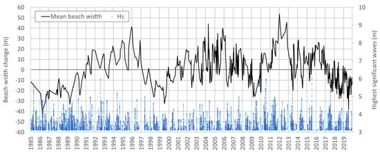 The analysis of the evolution of the beach as a whole allows us to establish relationships with wave conditions and episodes of higher energy. Figure 8 shows the average evolution of the beach, i.e., the average of all changes on all dates and locations and the hourly records of significant heights above the 95th percentile (Hs > 2.12 m). A thorough analysis of the distribution of the most aggressive waves shows that they occur more frequently during the winter. This is associated with a decrease in the width of the beach, which varies from year to year. In general, when the beach is more expansive, the seasonal variability is also wider, while in years when the beach is narrower, the variability is much less marked.