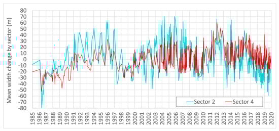 Comparison of the average beach width in sectors 2 and 4. Seasonal beach width variability is much higher (sometimes up to 80 m) in S2 than in S4.