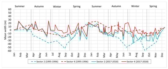 Seasonal beach width variability in sectors 2 and 4 (in blue and red respectively) during the years 1995–1996 (dashed line) and 2017–2018 (solid line). Both series present the width changes relative to the position at the start of the year.