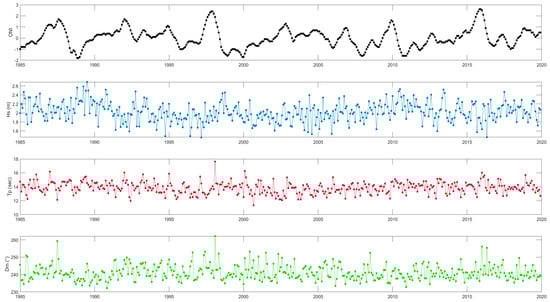 Figure 14 presents the ONI time series, where negative values are associated with the warm phase (El Niño). The El Niño events of the greatest magnitude that occurred between 1984 and 2020 are El Niño 1997–1998 and El Niño 2015–2016. When the ONI reaches its minimum value, historical maxima in period, direction, and significant height are observed. These results show that the wave heights in the El Niño phase increase.