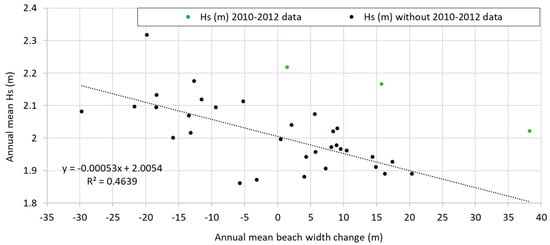 There is an anomaly in the behavior of the evolution of beach width concerning wave energy conditions. If we analyze the correlation between wave height and beach changes without considering data from 2010, 2011, and 2012, we detect substantial improvement in that relationship (R2 = 0.46).