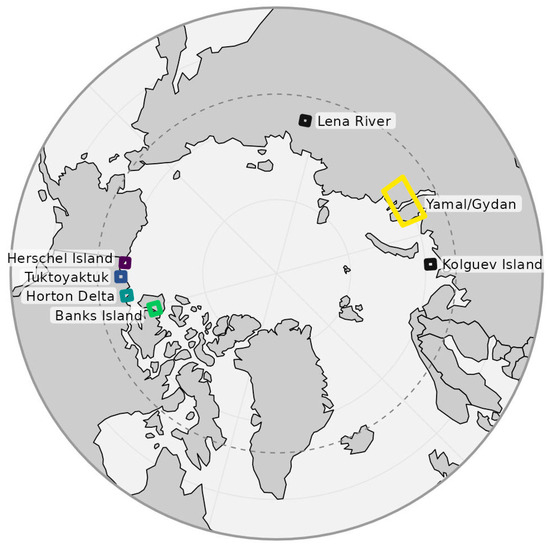 We selected seven sites across Arctic Canada and Russia where RTS have previously been identified (Figure 1; see Nitze et al. 2021; Yang et al. 2023 for further details) [39,63]. These sites span a broad range of environmental conditions from taiga to Arctic desert. Additionally, a subset of RTS features had already been manually delineated at these sites for model training and validation. In Arctic Canada, the study regions included Banks Island, Herschel Island, Horton Delta, and Tuktoyaktuk Peninsula. In Russia, the sites included Kolguev Island, a small section of the Lena River, and the Yamal and Gydan Peninsulas. Banks Island, Horton Delta, the Yamal and Gydan Peninsulas, and the Lena River site tend to have RTS formation along lakes or rivers, while Herschel Island, Tuktoyaktuk Peninsula, and Kolguev Island tend to have RTS formation along the coast. Herschel Island and the Yamal and Gydan Peninsulas have the smallest RTS features (typically <1 ha), while Banks Island has the largest features (exceeding 10 ha in some cases). All regions were used in model training, and all sites except the Lena River and Kolguev Island were used during model testing.