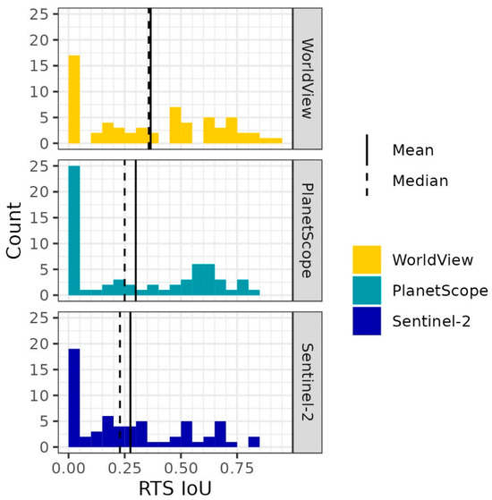 Histograms of the IoU scores of the RTS class across the testing dataset. Mean and median IoU scores are shown as solid and dashed lines, respectively.