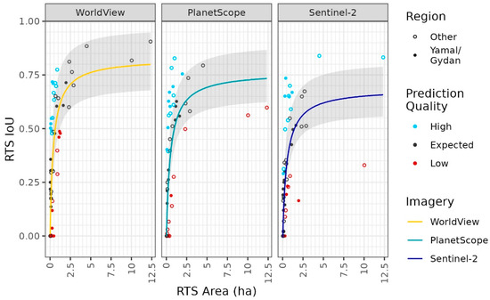 Overall, all three models had mean IoU scores within the range of those reported in other studies that used similar deep learning methods for RTS detection [39,63], although there were considerable differences across the three imagery types. As we hypothesized, WorldView imagery performed the best of the three imagery types across all metrics. The WorldView model had a smaller detection threshold than the other two models and also had a higher maximum RTS IoU, indicating that the WorldView model was the best at predicting RTS across all RTS Areas. At small RTS Areas, this can be explained purely by the sensor specifications; the higher-quality of WorldView imagery makes smaller objects visible and larger objects appear crisper, which allows for improved classification [81]. The fact that this improved performance even for larger RTS that were readily visible in both PlanetScope and Sentinel-2 may suggest that the models relied on smaller characteristics of RTS features that do not scale linearly with RTS Area and are more accurately represented by higher-resolution imagery. For example, the size of the RTS headwall is unlikely to change as rapidly as the area of the entire feature: the headwall length and depth could change somewhat, and sun direction and angle will affect its visibility across images, but the headwall will always remain a narrow strip in satellite imagery. Therefore, all else being equal, WorldView imagery should allow better detection of smaller characteristics of RTS regardless of the total area of the feature.
